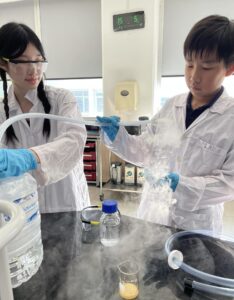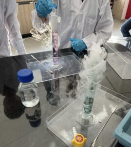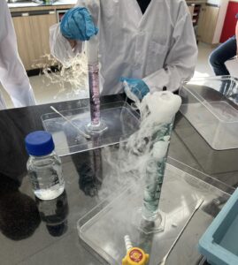 In this first experiment, we decided to do a twist on the classic dry ice experiemnt by adding Sodium Hydroxide and Universal indicator to water, to first form an alkaine solution. Then, we let the students add dry ice into the solution, resulting in a gradual colour change from purple to yellow as the pH was reduced. The science behind this, we explained, was that the dry ice (solid carbon dioxide ), as a non-metal oxide, reacted with water to produce an acid, which leads to the solution becoming more acidic.